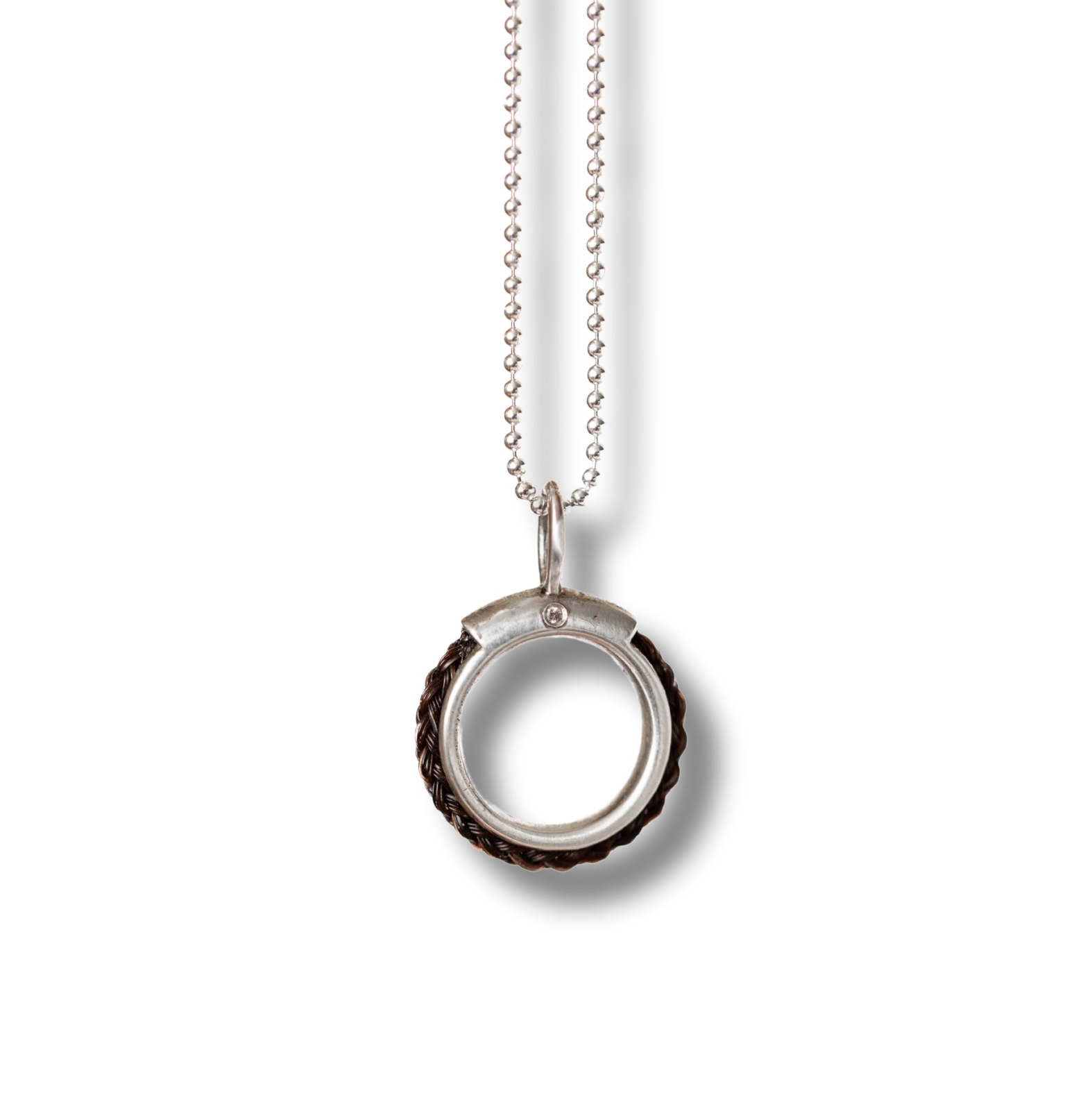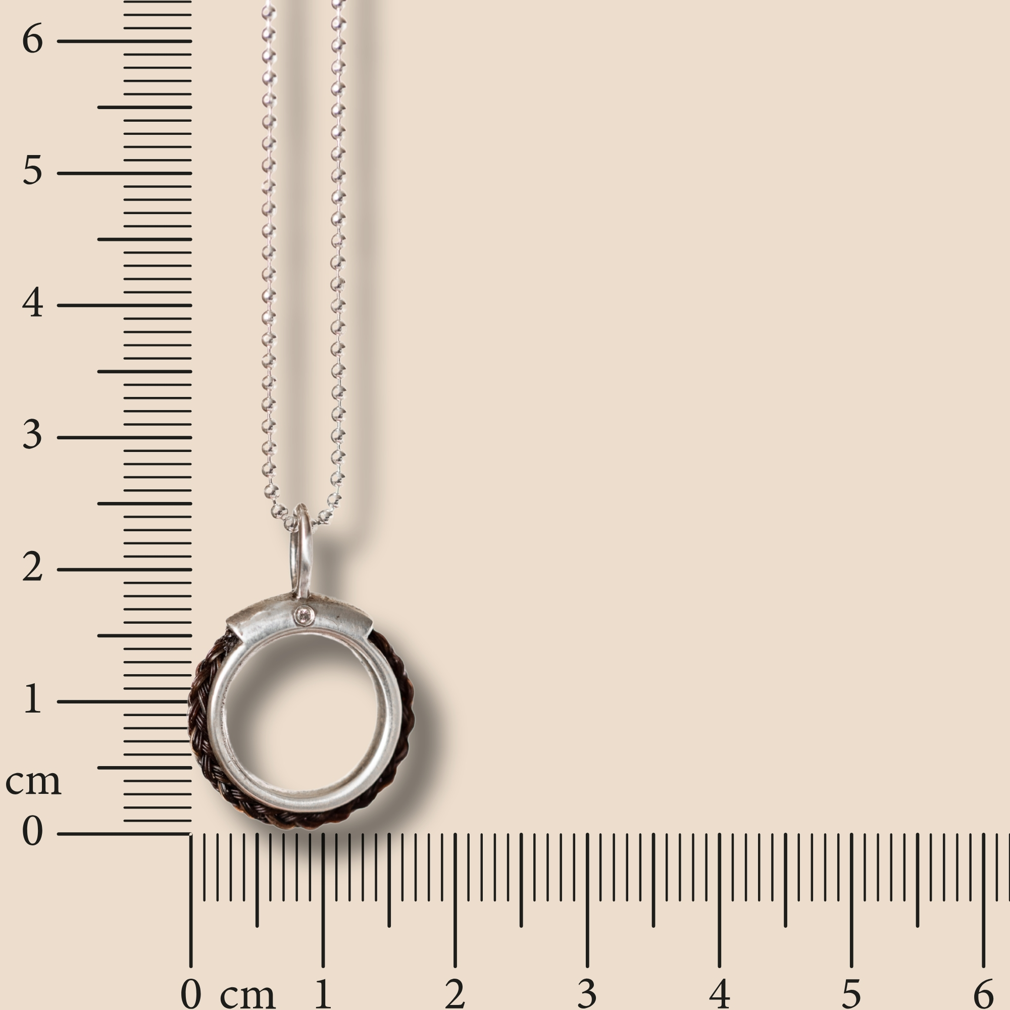 Kleiner runder Kettenanhänger aus 8 Strähnen geflochten Der Kettenanhänger Isabelle in runder Form ist ein schlichtes und dennoch sehr symbolträchtiges Schmuckstück. Die Kreisform steht für Ewigkeit und Verbundenheit und wird mit deinem eingesandten Pferdehaar einzigartig gefüllt. Ob puristisch ohne Stein oder mit einem kleinen Akzent: Du kannst oben im Kreis einen Zirkonia in deiner Wunschfarbe (Weiß, Champagner, Braun, Blau oder Grün) oder einen eleganten Brillanten wählen. Zusätzlich lässt sich Isabelle innen gravieren (bis zu 8 Zeichen, auch mit Datum oder Symbolen). So wird der Anhänger zu einem sehr persönlichen Erinnerungsstück. Handgefertigt in Freiburg, ist Isabelle ein echtes Unikat aus Pferdehaar und bewahrt deine Erinnerungen in einem klaren, zeitlosen Design.