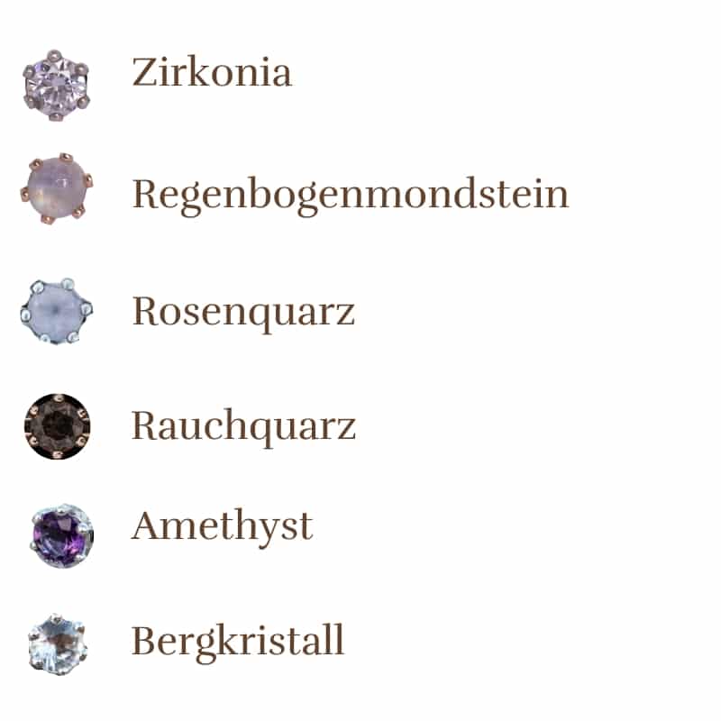 • Mit Zirkonia (inklusive) oder optionalen Edelsteinen: Rosenquarz, Rauchquarz, Bergkristall, Regenbogenmondstein, Amethyst